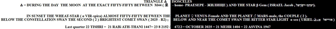 THE TRIANGLE ISOSCELES ∇ OF VERTEXES THE (2X1) SECOND BRIGHTEST COMET “SWAN”( YEAR 2025-F2) FIFTY-FIFTY BETWEEN M44 ( 巢 - home - ЖИЛИЩЕ ) ET THE STAR α Gem ( עֵשָׂו )