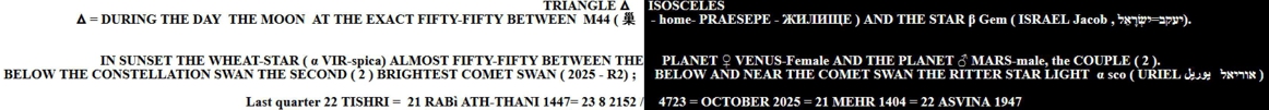 WITHOUT COMETS THE TRIANGLE ISOSCELES WITHOUT COMETS OF VERTEXES M44 ( 巢 - home - ЖИЛИЩЕ ) FIFTY-FIFTY BETWEEN : MARS ♂ and THE STAR β Gem( ISRAEL יעקב=יִשְׂרָאֵל). NUMBERING THE FIRST BRIGHTEST COMETS WITH A NUMERICAL BASE OF Exponentiation 2 THE TRIANGLE ISOSCELES ∇ OF VERTEXES THE MOON NEAR THE WHEAT-STAR ( α VIRGINIS – חיטה ) FIFTY-FIFTY BETWEEN : THE BRIGHTEST COMETS(2X2) OURTH ( THE H2/2010)AND (2X4)EIGHTH (THE G2/2021). THE TRIANGLE ISOSCELES ∇ OF VERTEXES THE (2X1) SECOND BRIGHTEST COMET “SWAN”( YEAR 2025-F2) FIFTY-FIFTY BETWEEN M44 ( 巢 - home - ЖИЛИЩЕ ) ET THE STAR α Gem ( עֵשָׂו ) OTHERS COMETS THE TRIANGLE ISOSCELES ∇ OF VERTEXES THE RITTER-STAR α leo ( רפאל, "Raffael" , رفائيل ),FIFTY-FIFTY BETWEEN THE THIRD-BRIGHTEST COMET (29P)AND MARS ♂. THE TRIANGLE ISOSCELES ∇ OF VERTEXES THE COMET BRIGHTEST ( LINEAR 217 ) FIFTY-FIFTY BETWEEN THE SIXTH BRIGHTEST COMET (J2 /2024)AND VENUS ♀. 10 Dhu I-Hijja 1446 = 11 SIVAN 5785 / 2025 י״א בְּסִיוָן תשפ״ה